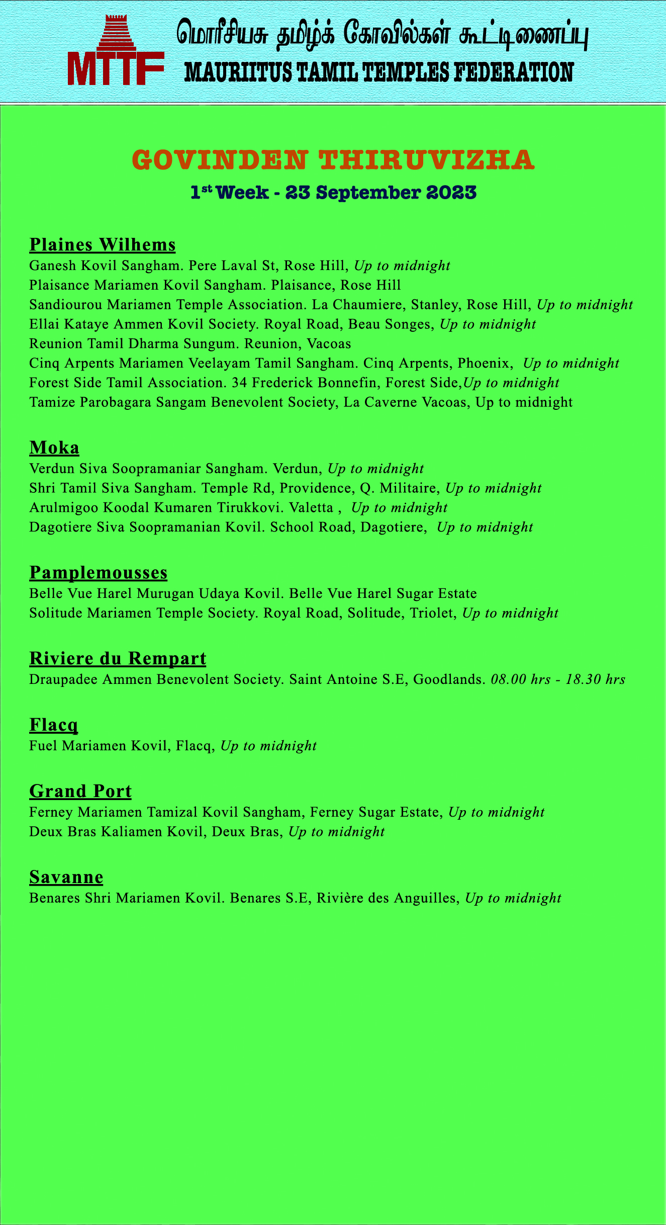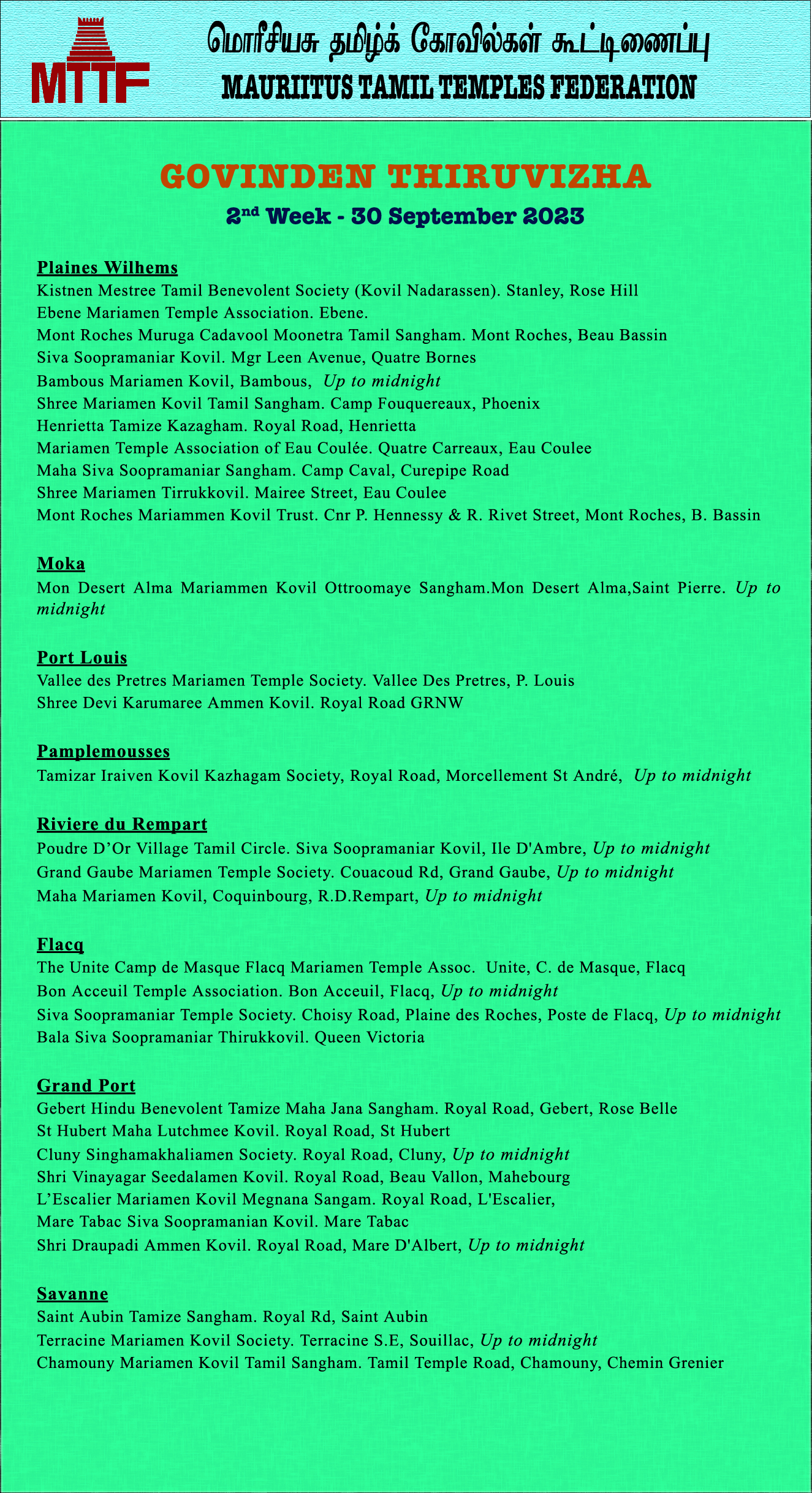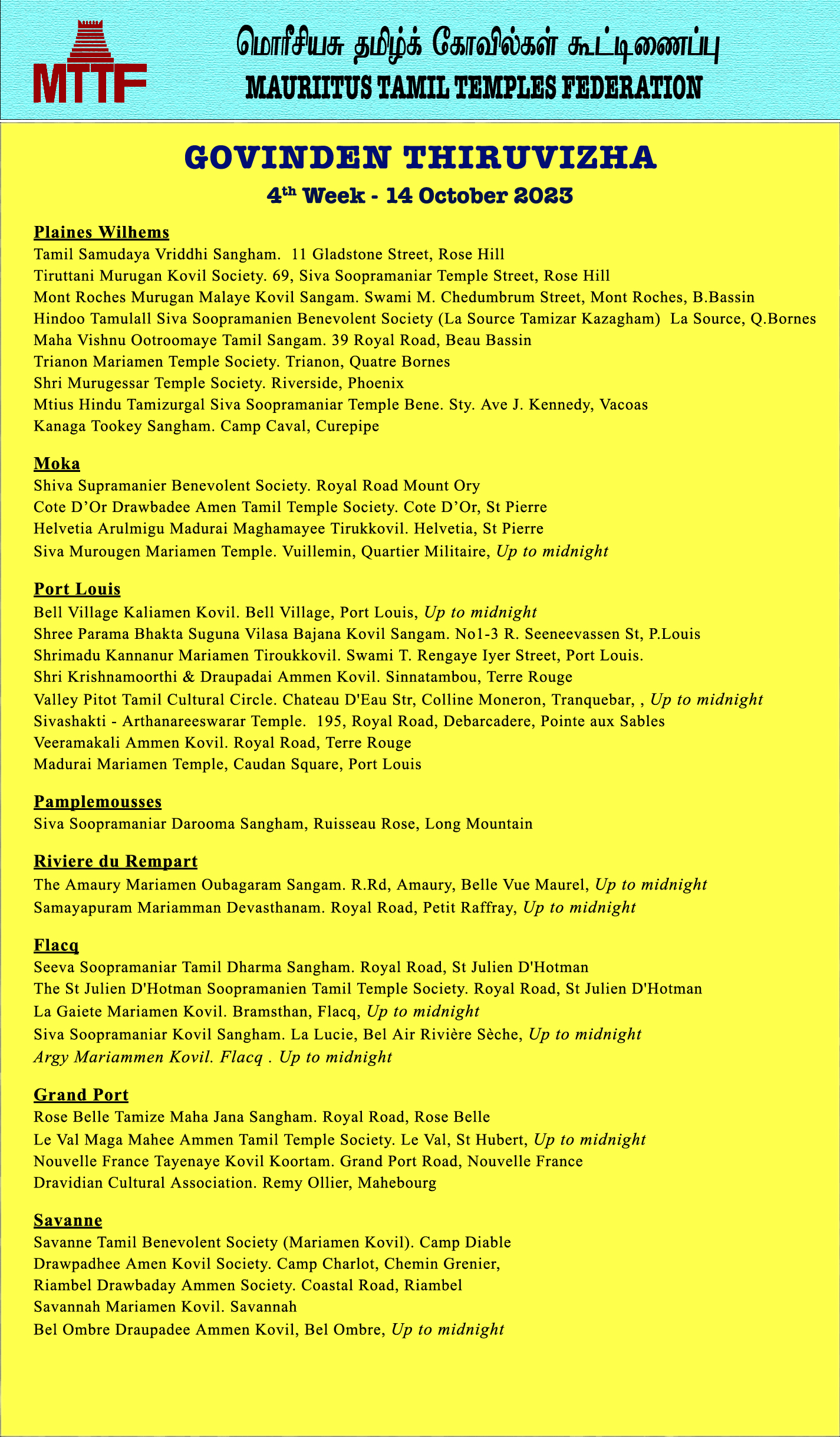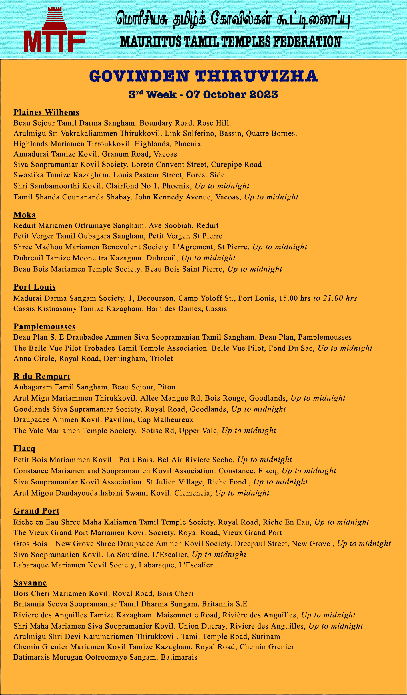 List of Kovils celebrating Govinden Thiruvizha 2023